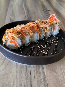 The roll consists of fried shrimp and fresh salmon topped with crab mix and spicy sriracha sauce.